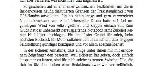 So geschehen auf einer meiner zahlreichen Testfahrten, um die in Insiderkreisen häufig diskutierten Grenzen der Praxistauglichkeit von GPS-Handys auszuloten. Ein bis dahin lange und gern verwendeter Notebookrucksack vom Zubehörhersteller Dicota hatte sich bei ungünstigem Wind von selbst geöffnet und klappte einfach auf. Zum Glück hat das unbemerkt herausgleitende Notebook samt Zubehör keinen Nachfolger erschlagen. Ein handfester Grund für mich, beim nächsten Rucksack für Motorradfahrer darauf zu achten, dass er gegen Selbstöffnung günstiger konzipiert und vor allem abschließbar ist.